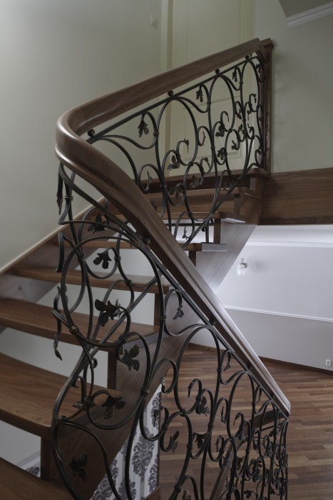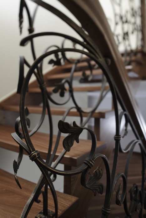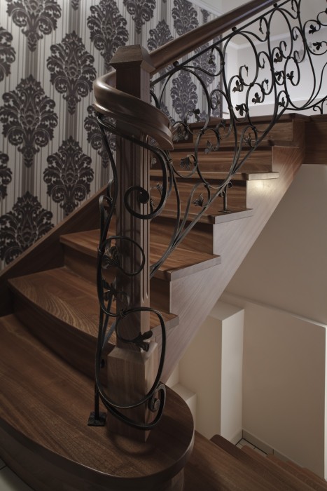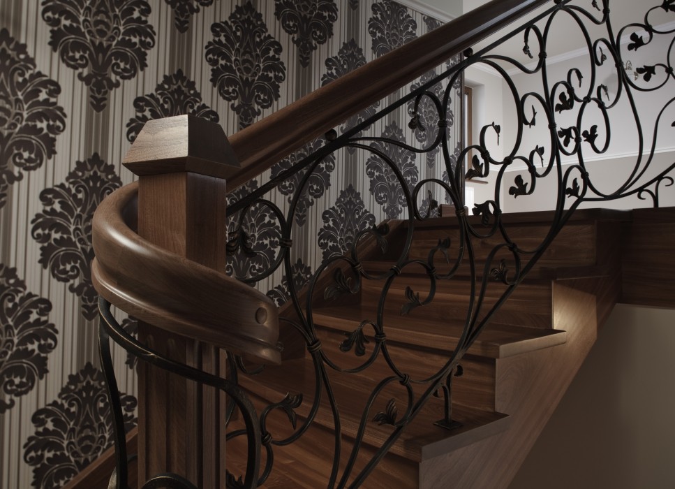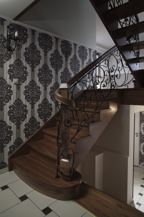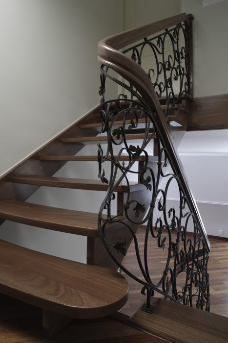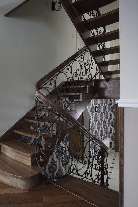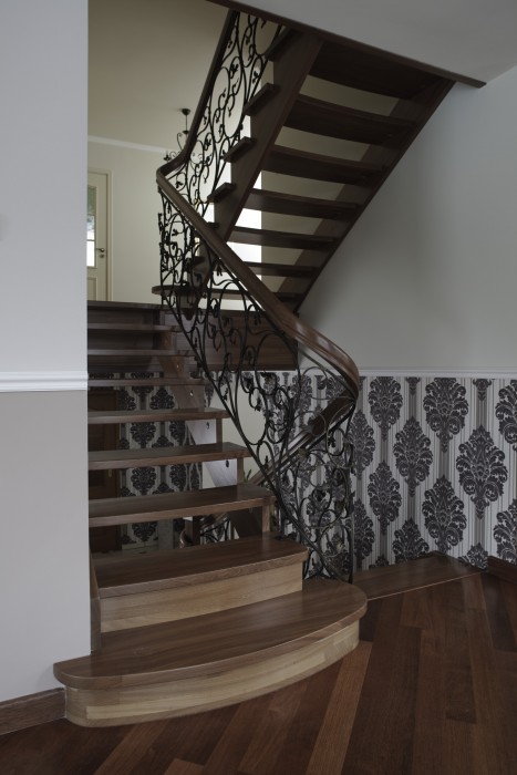 Schody będące połączeniem dwóch najczęściej stosowanych rozwiązań konstrukcyjnych – policzka klasycznego z wyfrezowaniami od zewnątrz biegu schodowego i policzka osiodłanego od strony wewnętrznej. Dzięki temu schody mogą ściśle przylegać do ściany zewnętrznej. Natomiast od wewnątrz stopnie spoczywają na policzku osiodłanym, co dodatkowo nadaje im efektowny wygląd.